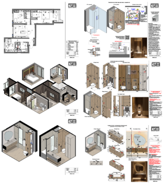 • Богатые развертки (чтобы изучить наполнение и расположение оборудования ванной комнаты, где выведены электровыводы, выключатели и встроены розетки, сантехнические выводы, расположение освещения, сантехники, аксессуаров, отметка предполагаемой фурнитуры, уникальные решения и т.д.)
